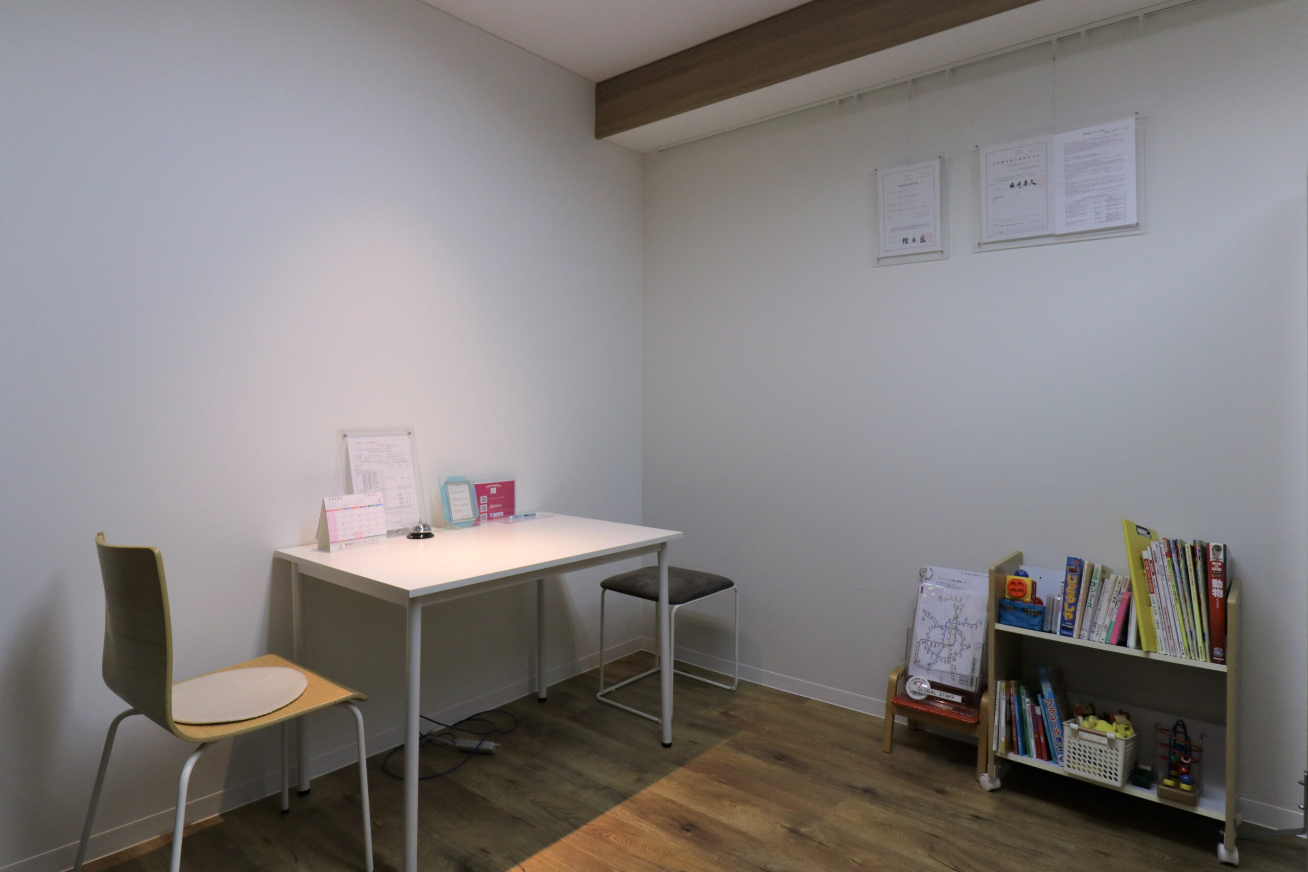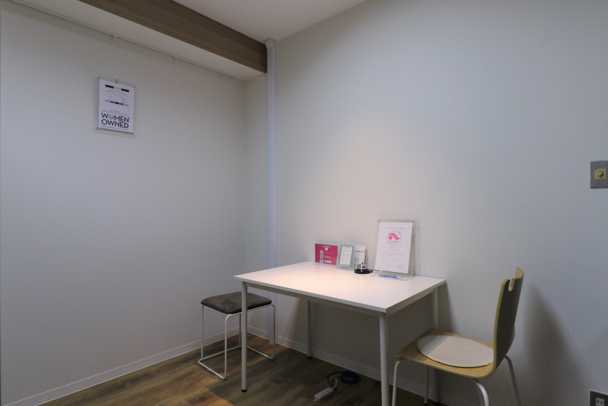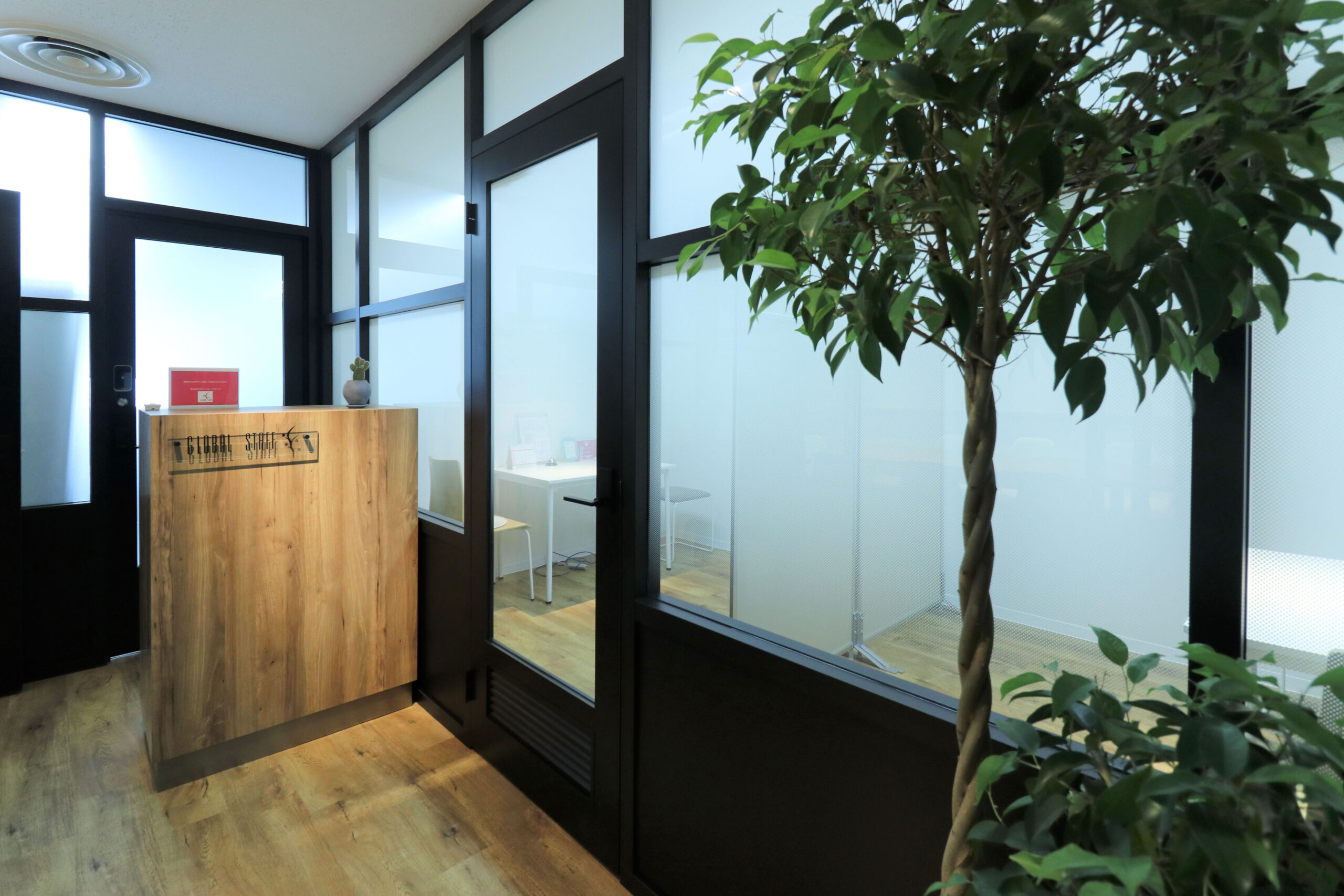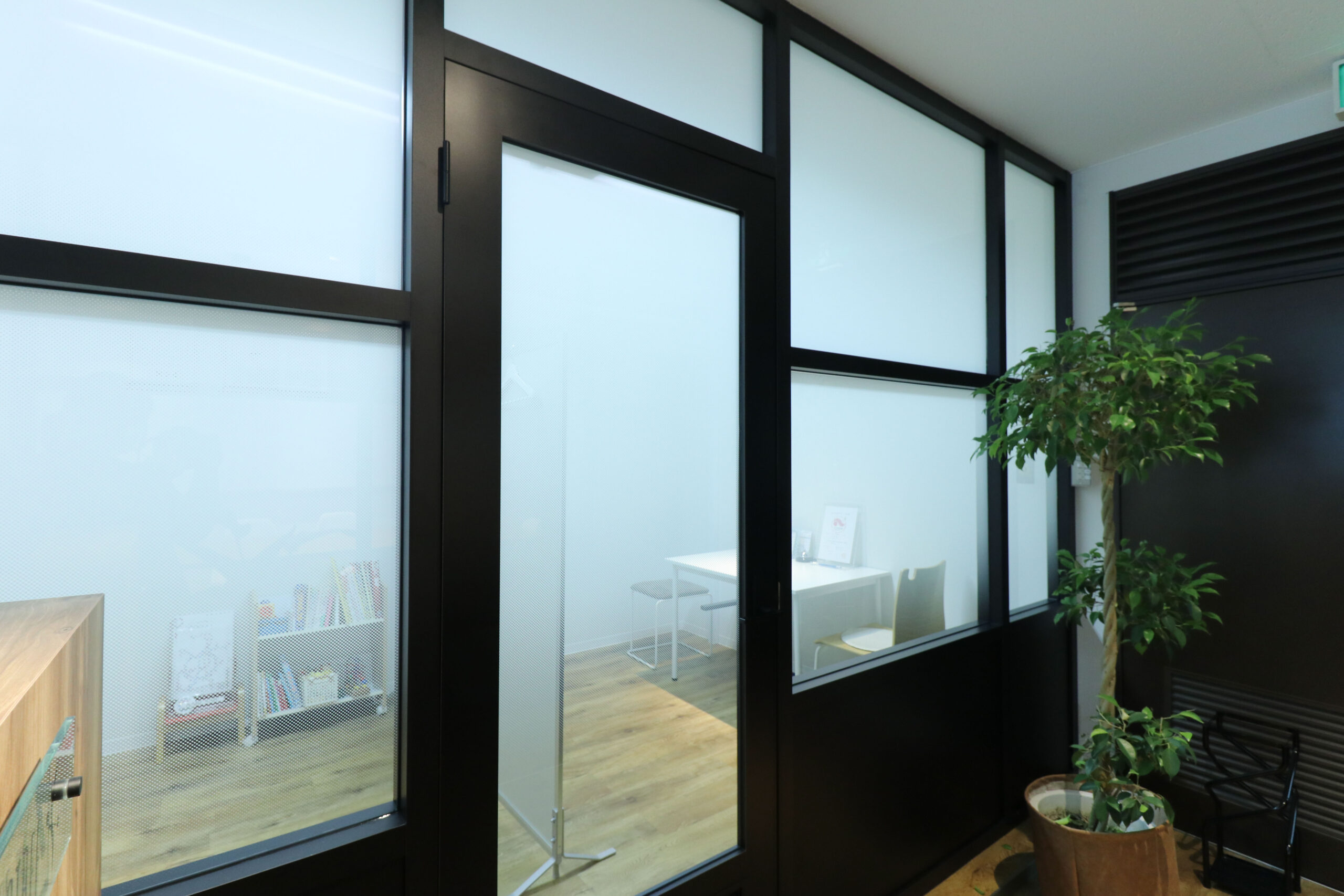 お客様を案内する部屋は、上からグラデーションで目隠しシートを貼り、他の来客の方が気にならないよう、配慮しています。