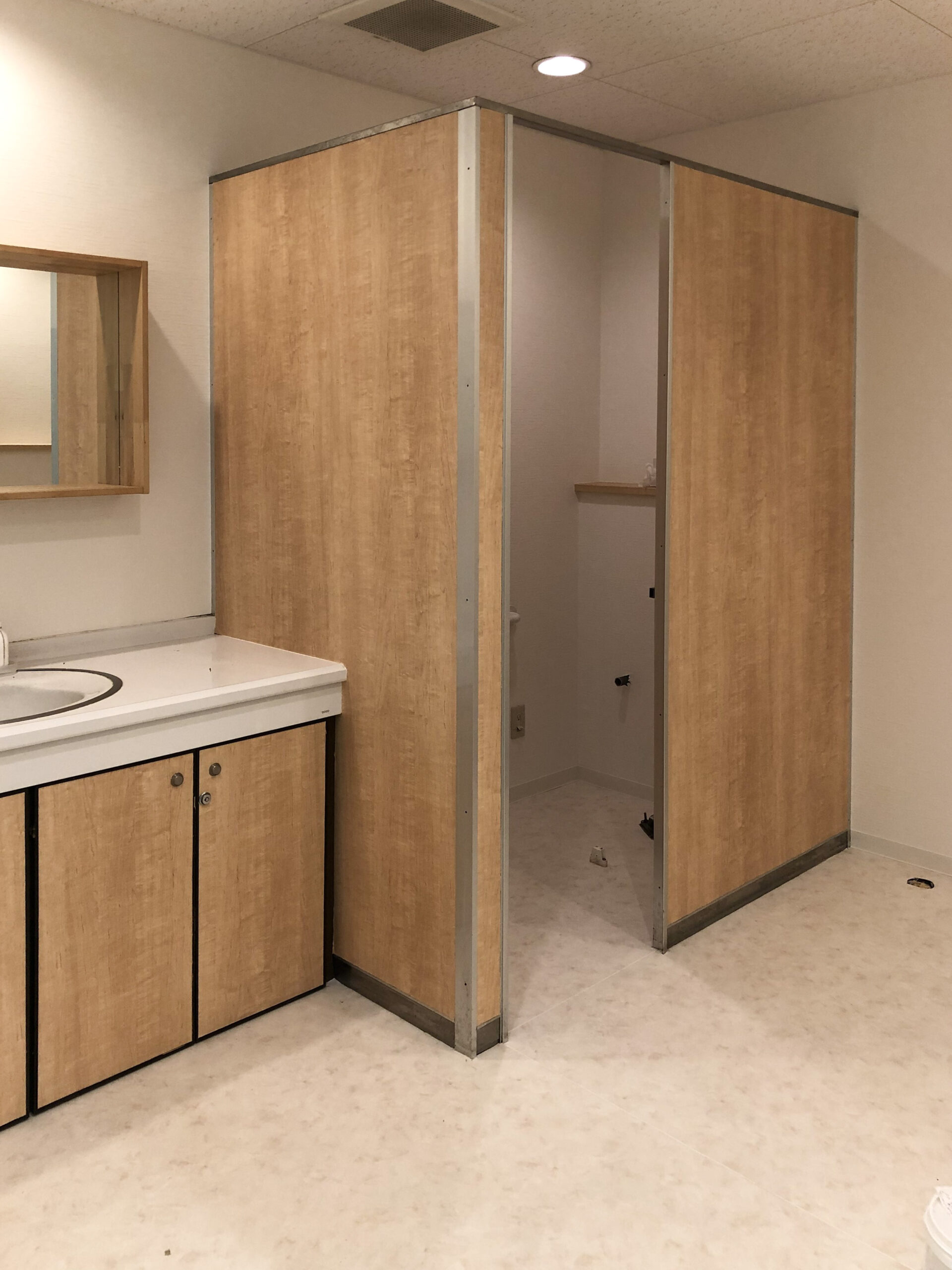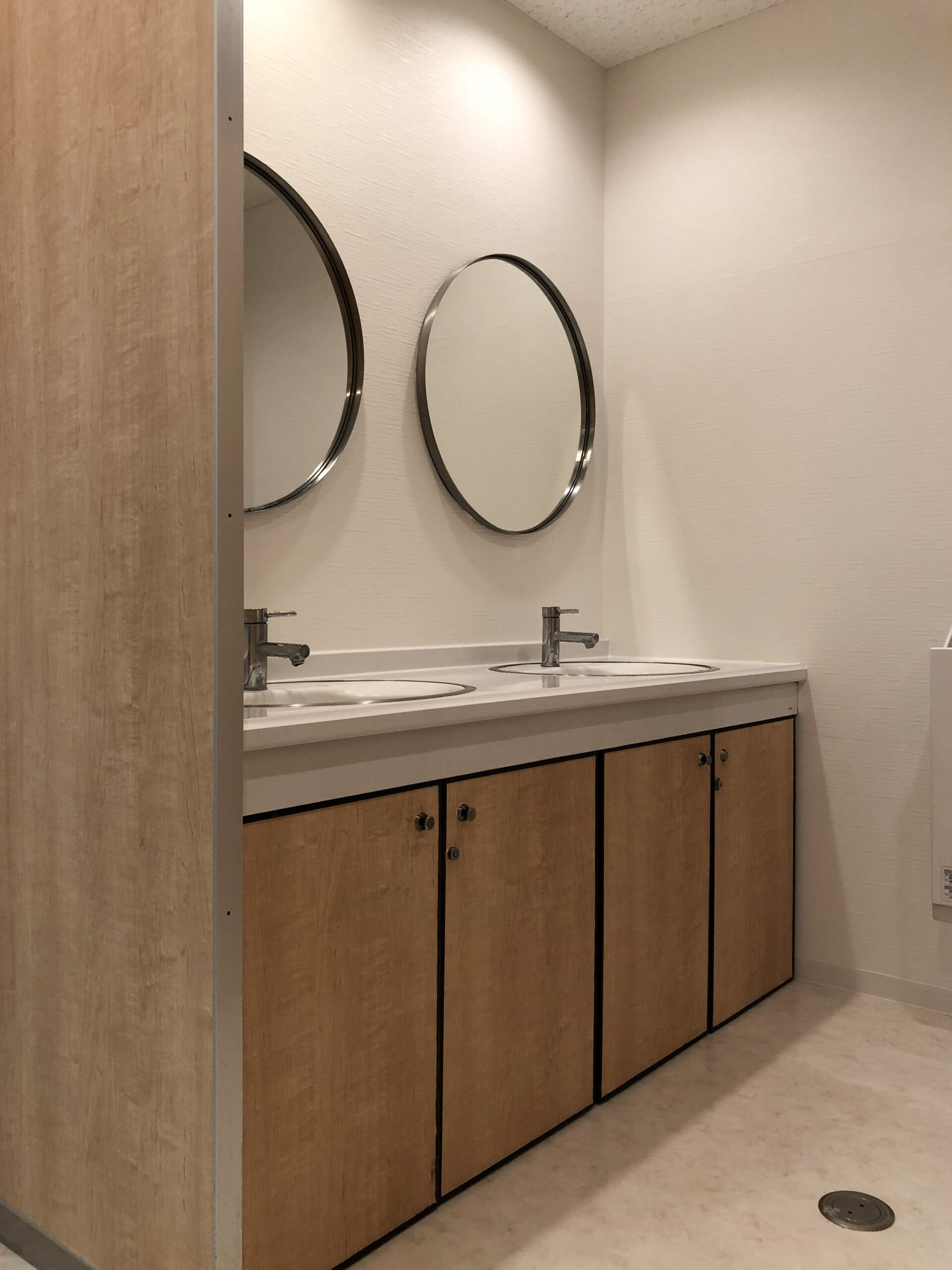 水回りで、床やクロスを白にしているので冷たい印象になりがちですが、収納扉やパーテーションをナチュラルな木目にすることで明るさを損なわず、温かみのある空間になりました。