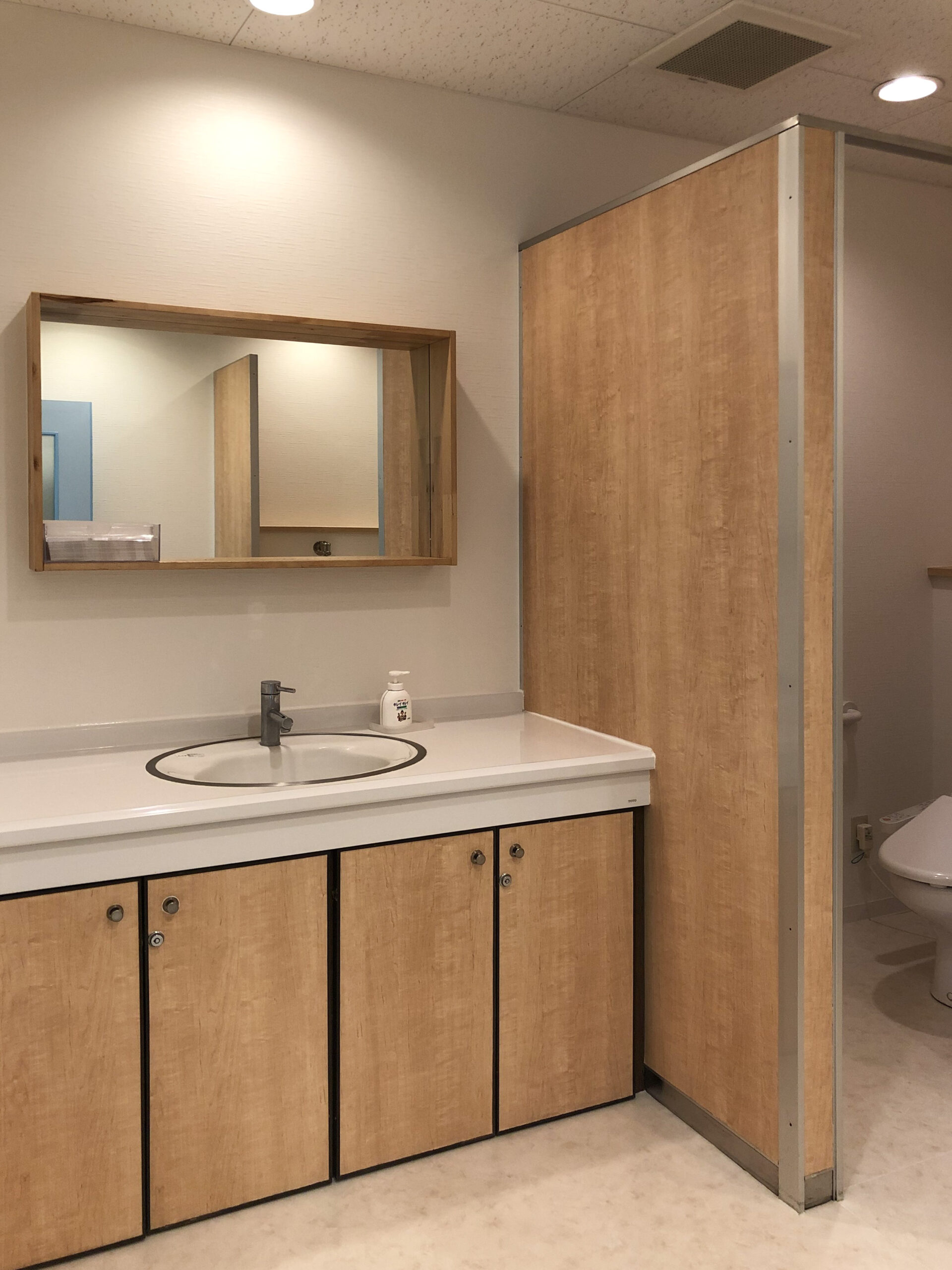水回りで、床やクロスを白にしているので冷たい印象になりがちですが、収納扉やパーテーションをナチュラルな木目にすることで明るさを損なわず、温かみのある空間になりました。