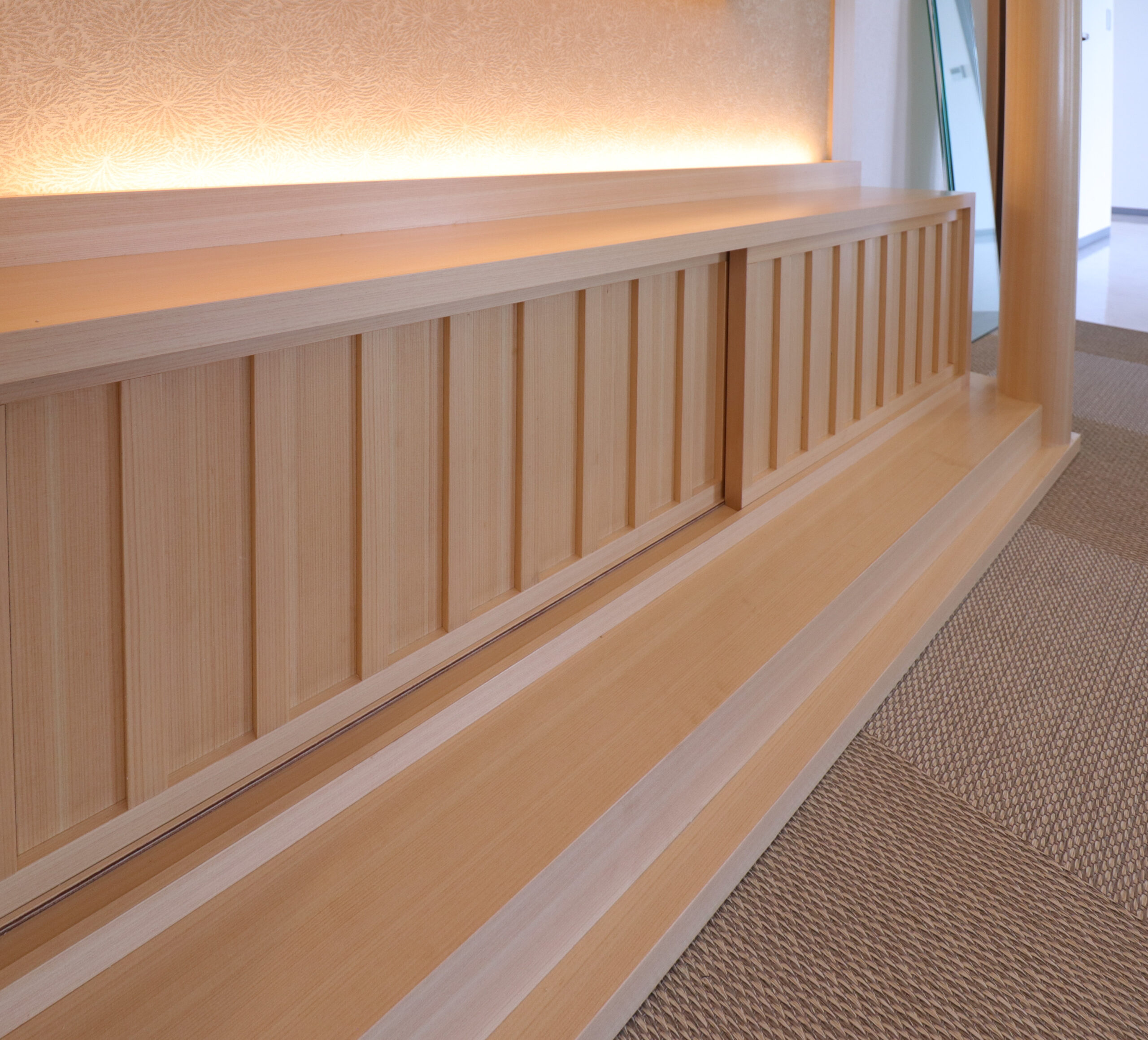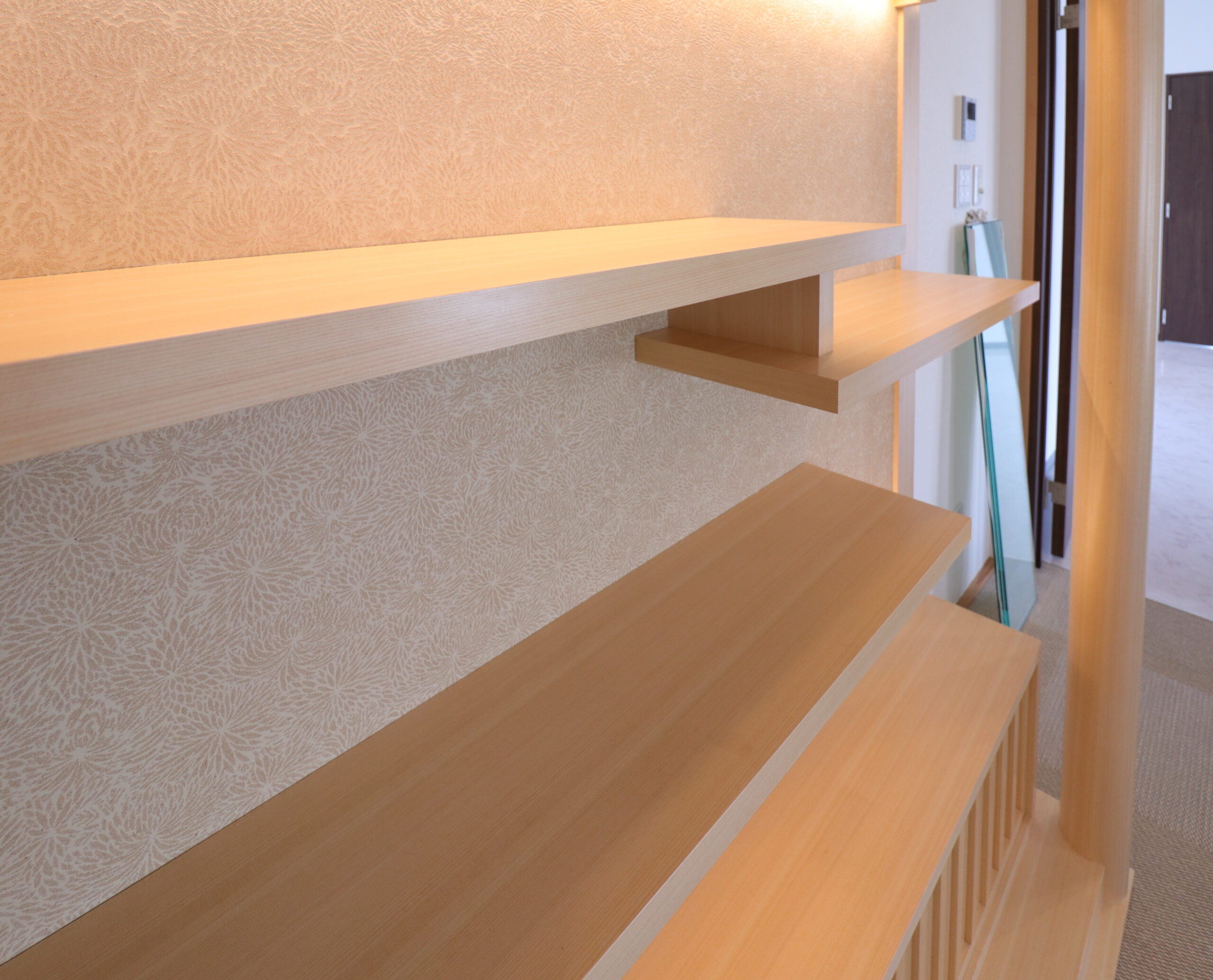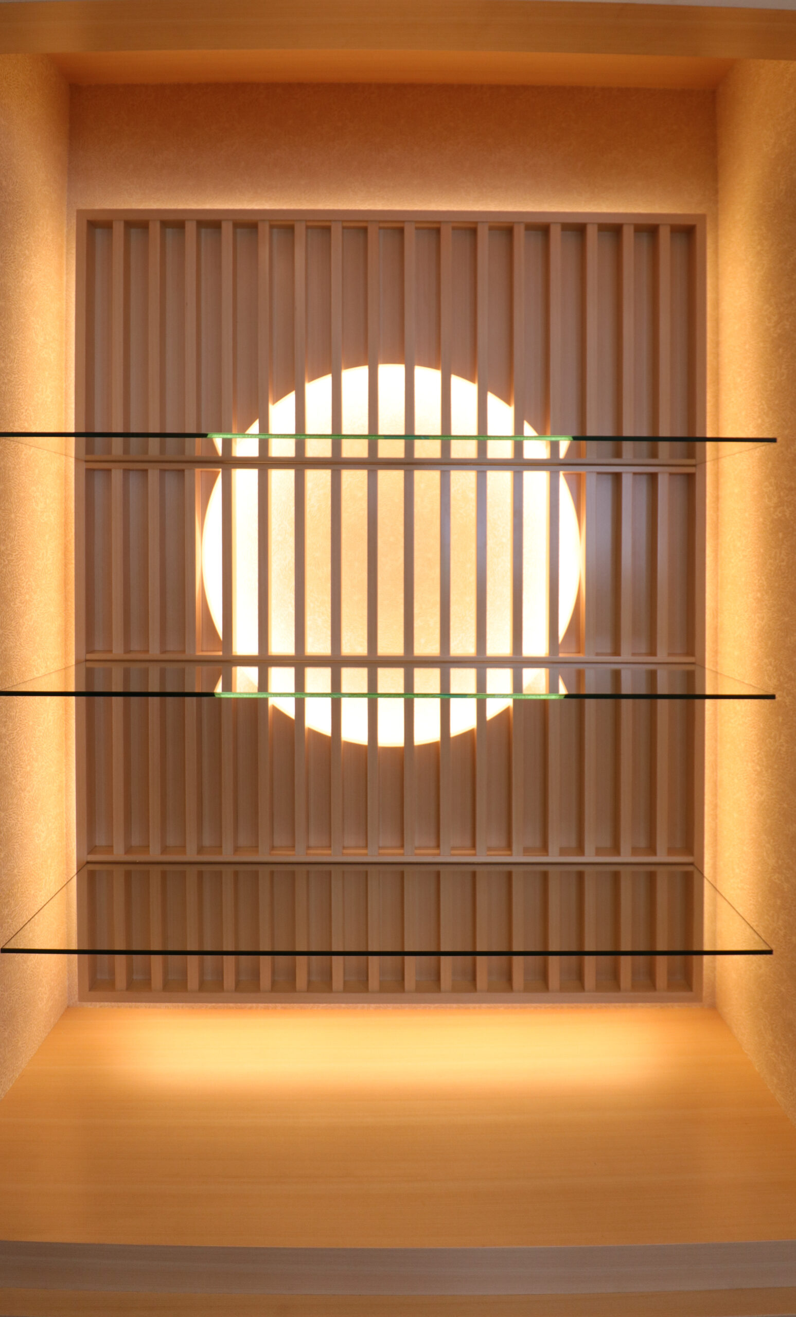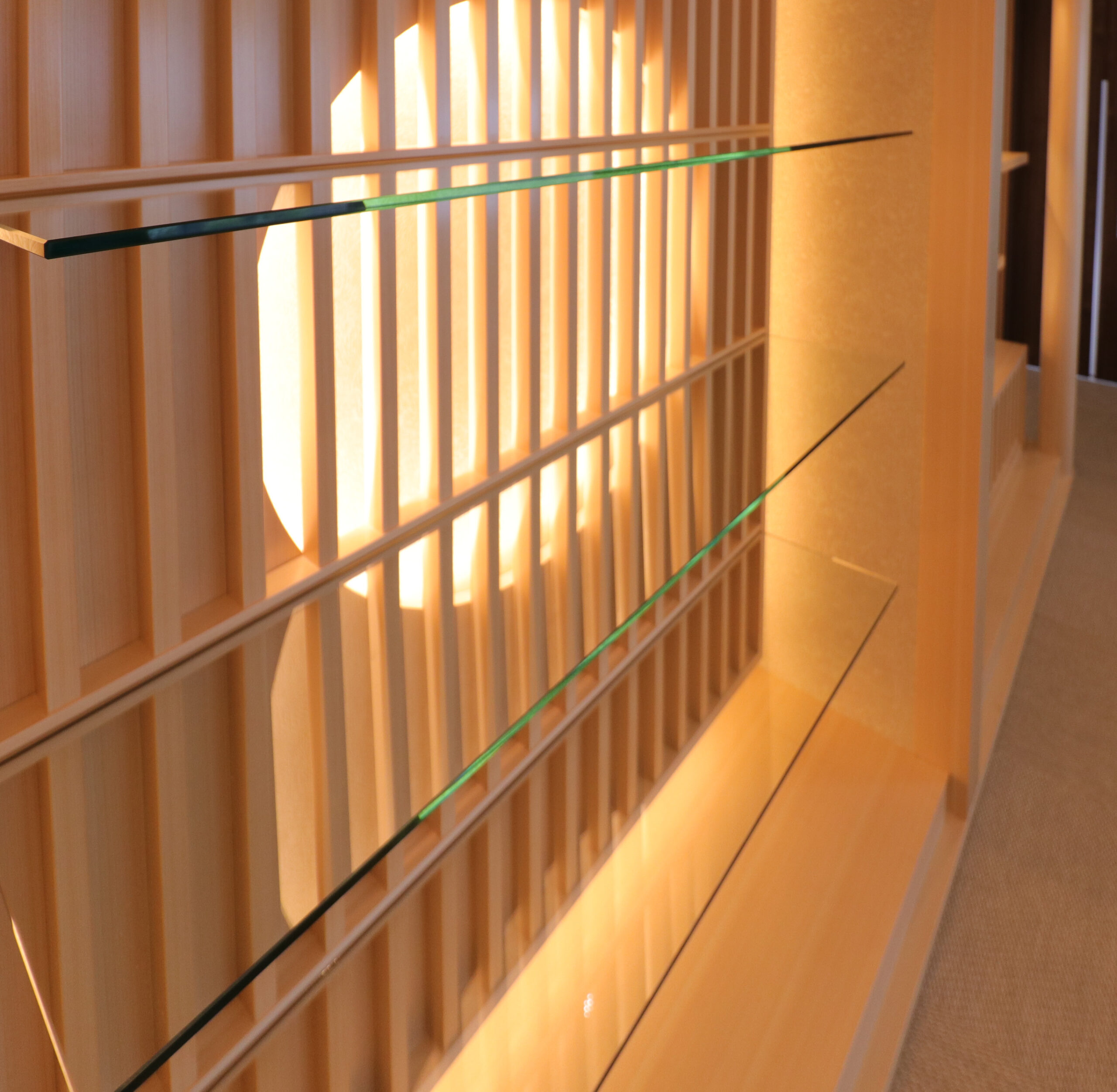 TOKONOMA家具を製作するにあたって、檜の突板と和柄のクロス、格子で和の心地良さを、そこにガラスの棚板と間接照明の現代的なおしゃれさを組み合わせることで和洋折衷を表現しました。