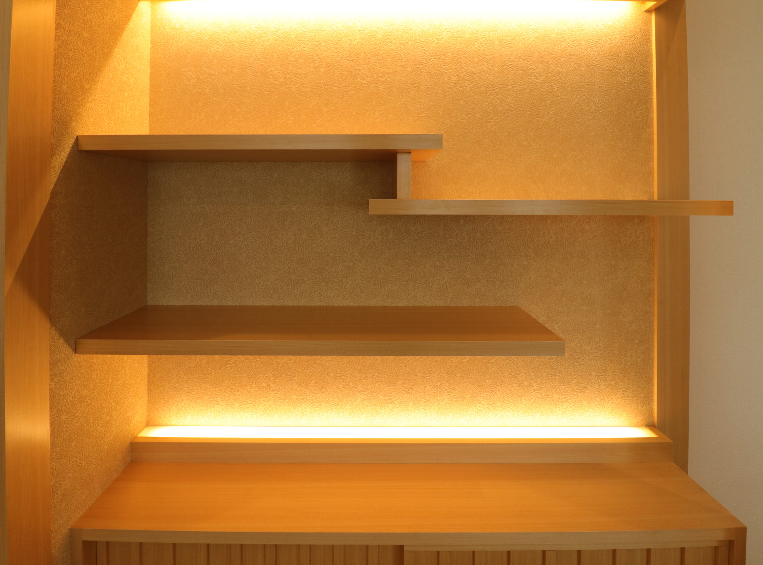 間接照明は装飾品を目立たせるとともに、暖かいリラックスできる空間を演出します。